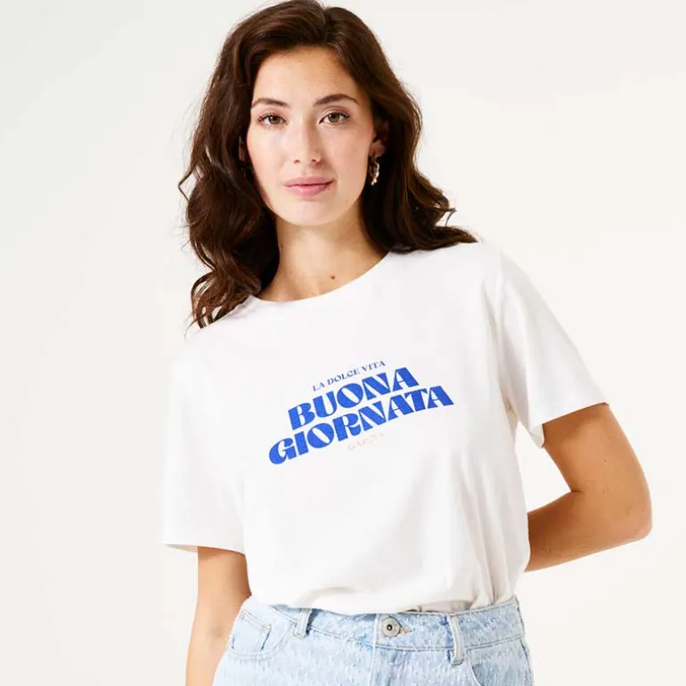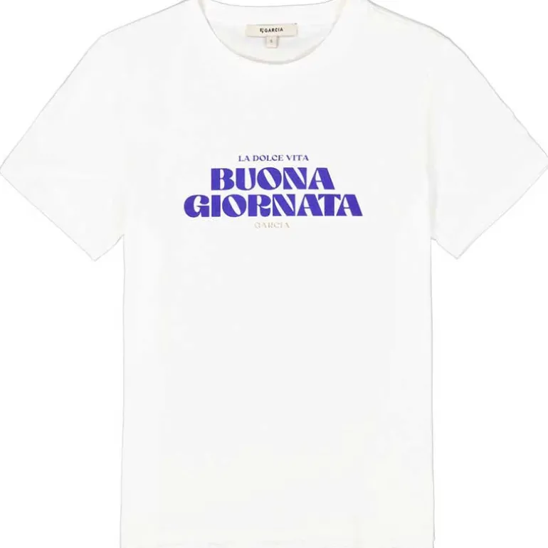 Råhvid t-shirt fra Garcia med tryk på brystet.