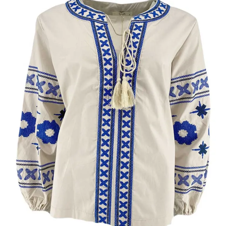 Flot broderet bluse i sandfarvet fra J By J.