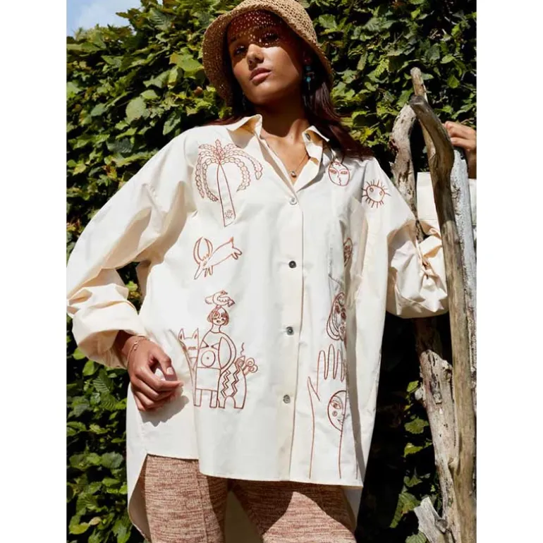 Oversized broderet skjorte fra M. Wiesneck i lys sandfarvet.